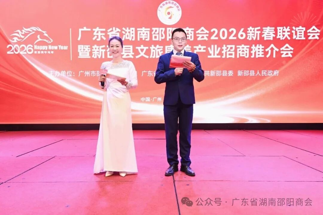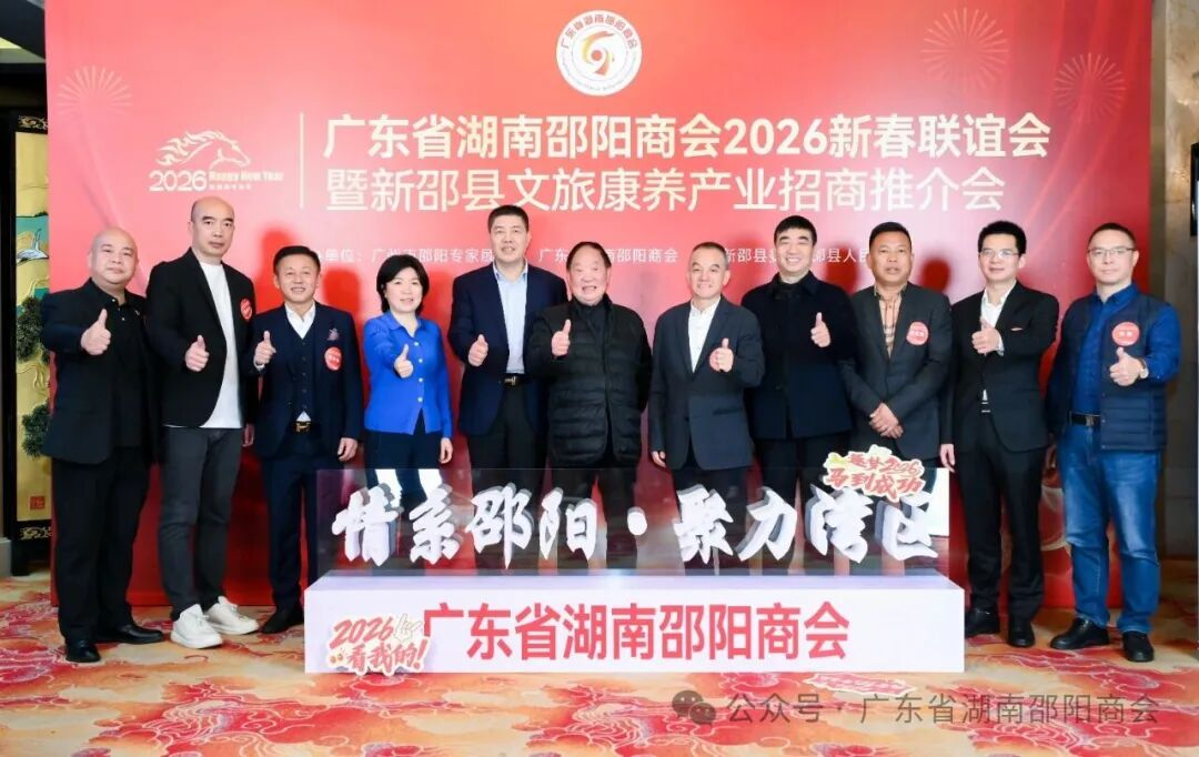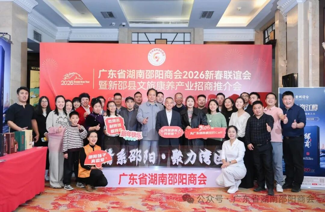 珠水含情,邵贤聚粤。1月28日,广东省湖南邵阳商会“情系邵阳·聚力湾区”2026新春联谊会暨新邵县文旅康养产业招商推介会在阳光酒店一楼宴会厅隆重举行。来自邵阳市、湖南省驻粤办及各地的领导嘉宾、商会会员、专家顾问、乡贤同仁近700人齐聚一堂,共叙桑梓情谊,共话发展机遇,共贺甲辰蛇年尾声,同迎丙午马年新程。