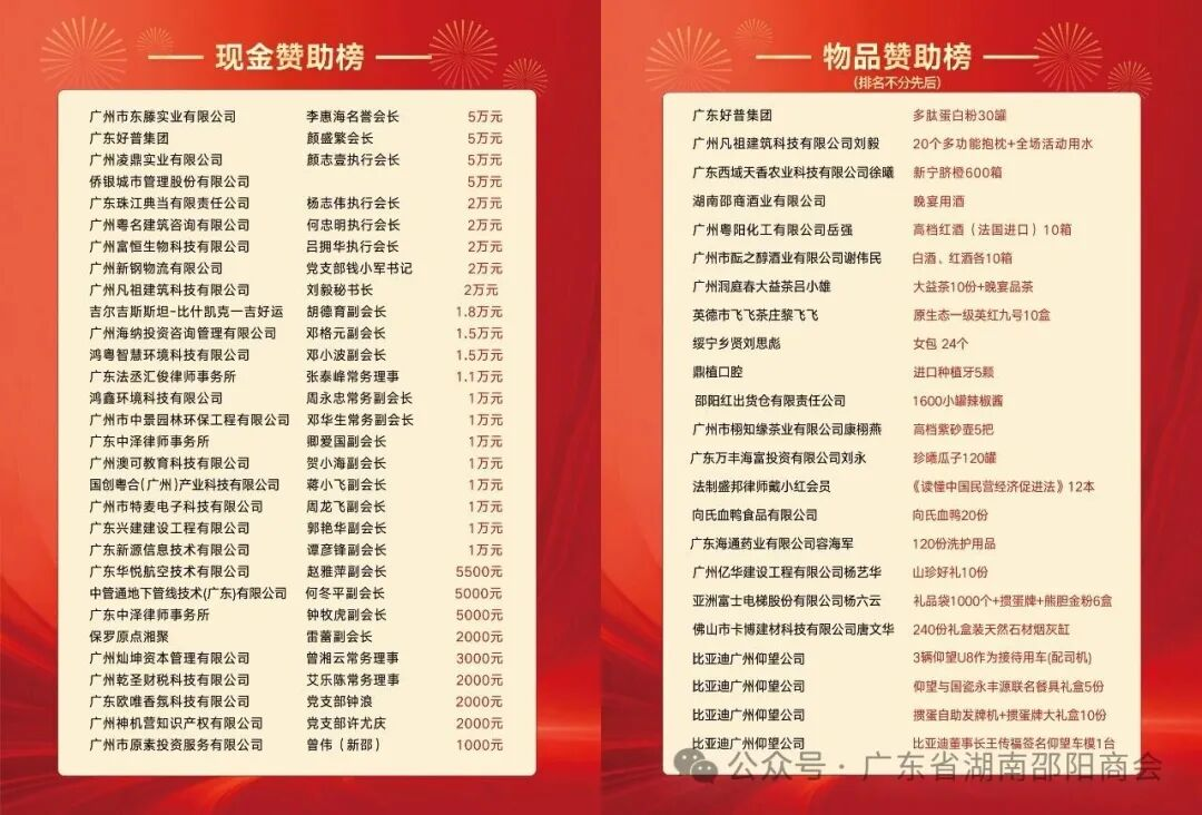 一场盛会的成功,离不开每一份鼎力支持。主持人代表商会鸣谢所有赞助单位与乡贤,本次联谊会共募集赞助费近48万元,另有多家企业提供了丰富物资。广州市东滕实业、广东好普多肽生物科技、侨银股份等企业慷慨解囊,提供资金支持;广东西域天香农业科技、佛山市卡博建材科技、亚洲富士电梯、广东沂台酒业等企业贴心筹备物资,为晚宴添彩。主持人表示,每一份赞助都承载着对商会、对乡贤的深厚情谊,商会将永远铭记这份担当与热爱,所有赞助单位名单已在背景墙公示,感谢每一位倾情助力的同仁。