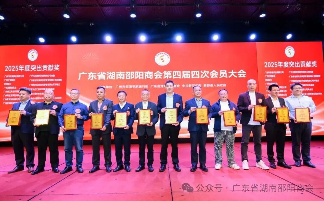 随后,评优颁牌环节有序开展,分别为优秀县区代表、优秀联络处、优秀会员及突出贡献企业颁奖。新邵县邓小波、隆回县贺小海、邵阳县钟牧虎荣获优秀县区代表;保罗原点湘聚、南国尚品酒家获评优秀联络处。广州市东滕实业、广东好普集团、侨银股份等49家企业及个人荣获突出贡献企业称号,各获奖代表依次上台领奖,现场掌声不断,见证邵商的责任与担当。