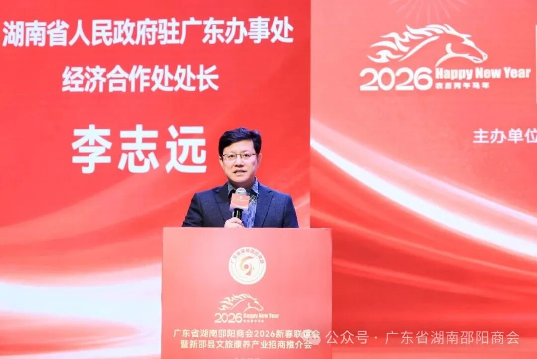 湖南省人民政府驻广东办事处经济合作处处长李志远先生上台讲话,他对广东省湖南邵阳商会的工作给予高度肯定,赞扬了邵商在粤发展的成就与回乡投资的情怀,希望商会继续发挥桥梁纽带作用,凝聚更多邵商力量,在服务会员、助力家乡发展、推动粤湘合作中再立新功,同时预祝全体邵商马年吉祥、事业兴旺。